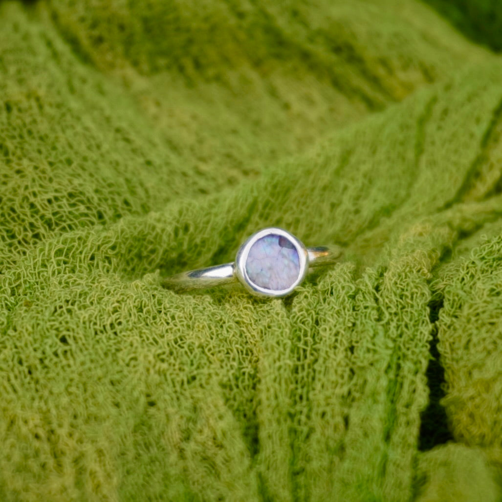Handmade sterling silver ring with Abalone Shell from New Zealand, open bottom, shell has small crack, plain band, plain bezel. Size 12.5