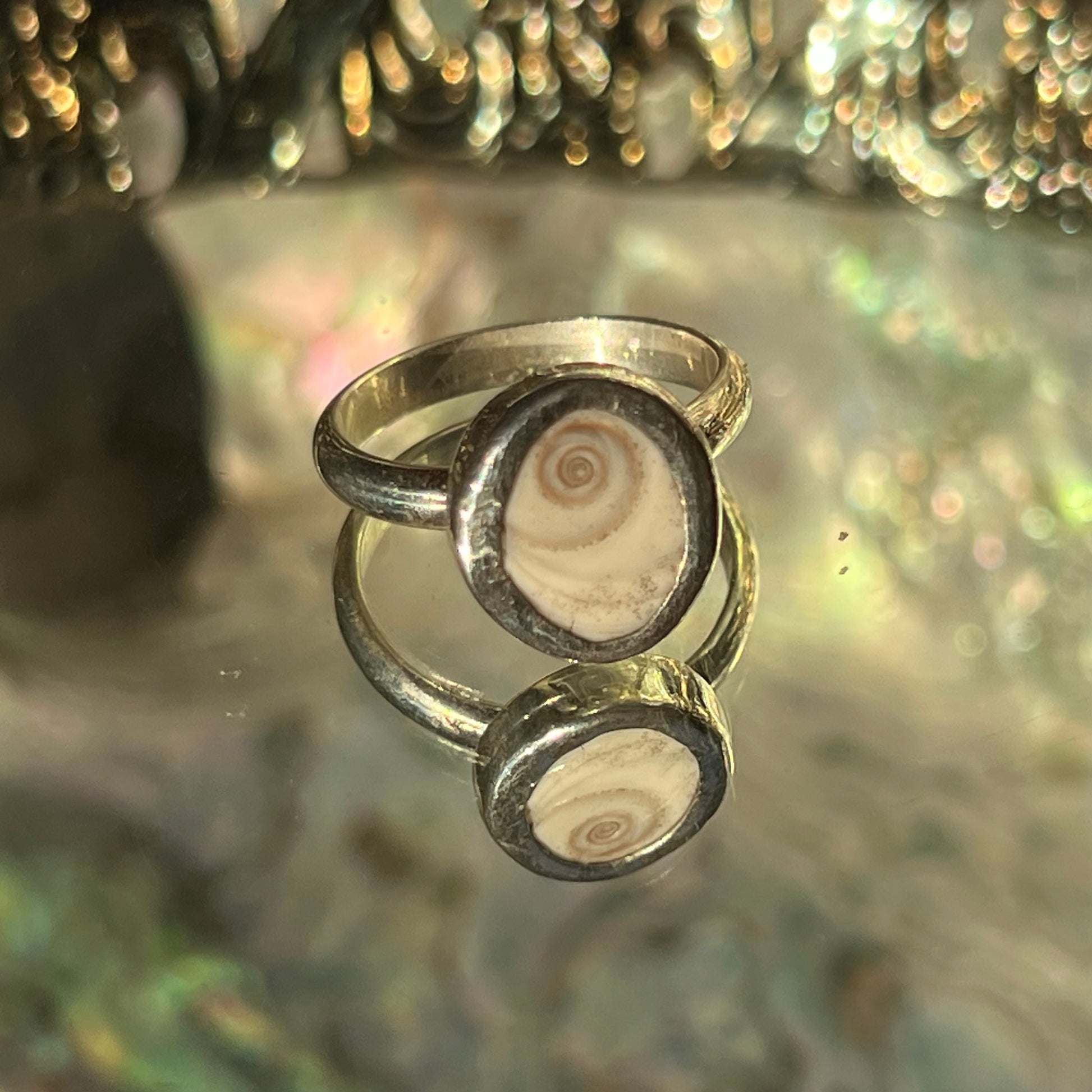 Handmade sterling silver ring with Shiva Shell from New Zealand, plain band, plain bezel. Size 8.5